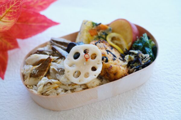 麦ご飯(精白米(国産)、精白麦(国産))、塩サバ(さば、食塩)、ぎせい豆腐(豆腐、鶏卵、にんじん、うすくちしょうゆ、きび糖、三つ葉、乾燥しいたけ、なたね油)、具沢山がんも(豆腐、キャベツ、にんじん、うすくちしょうゆ、ごぼう、乾燥しいたけ、なたね油、片栗粉、しょうが、食塩)、醤油麹和え(なす、しょうが、醤油麹、みりん、穀物酢、花鰹)、さつま芋のレモン煮(さつまいも、きび糖、レモン、レモン果汁、食塩)、キャベツとひじきのペペロン炒め(キャベツ、乾燥ひじき、オリーブ油、食塩、うすくちしょうゆ、みりん、にんにく)、ごま和え(こまつな、こいくちしょうゆ、かつお・昆布だし、ごま、きび糖)、酢レンコン(れんこん、穀物酢、きび糖、食塩、とうがらし)、(一部に小麦・卵・ごま・さば・大豆を含む)