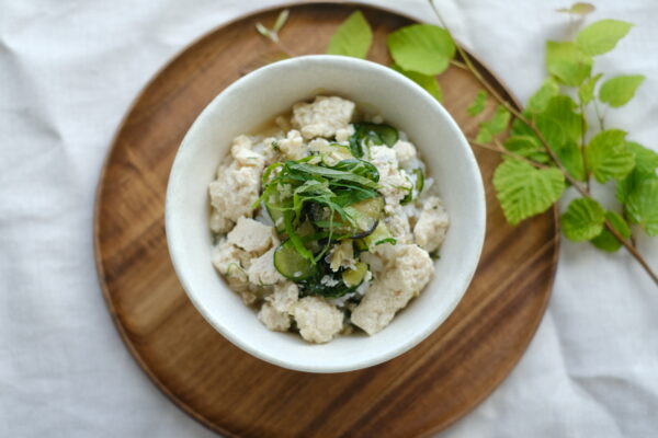 宮崎の郷土料理「冷や汁」は、高温多湿の宮崎で暑さをしのぐ知恵として根付いたごはんです。うぶすなの冷や汁には、きゅうり・みょうが・大葉など爽やかな香りの夏野菜と、九州産大豆の木綿豆腐、長崎県産(アジの水揚げ量日本一!の松浦市漁港)のアジ開きのほぐし身が入って、しっかり食べごたえがありながらも、さらさらと口あたり軽くお召し上がりいただけます。うぶすなキッチンでじっくり煮出した鹿児島県枕崎産のかつおと昆布・いりこの出汁を合わせて、しみじみおいしい冷や汁に仕上げました。 食欲がない朝に、慌ただしい日のランチに、体をいたわりたい夜に。 あつあつの炊きたてごはんの上にかけてお召しあがりください。